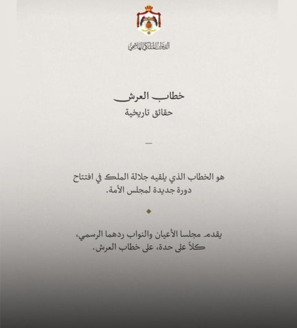 مع اقتراب خطاب العرش السامي يوم الاحد بافتتاح الدورة العادية الثانية لمجلس الأمة، نشر الديوان الملكي الهاشمي، الجمعة، سلسلة من المواد التعريفية عبر خاصية "الستوري" على حساباته في مواقع التواصل الاجتماعي، تناولت "خطاب العرش السامي" من جوانبه الدستورية والتاريخية والموضوعية.