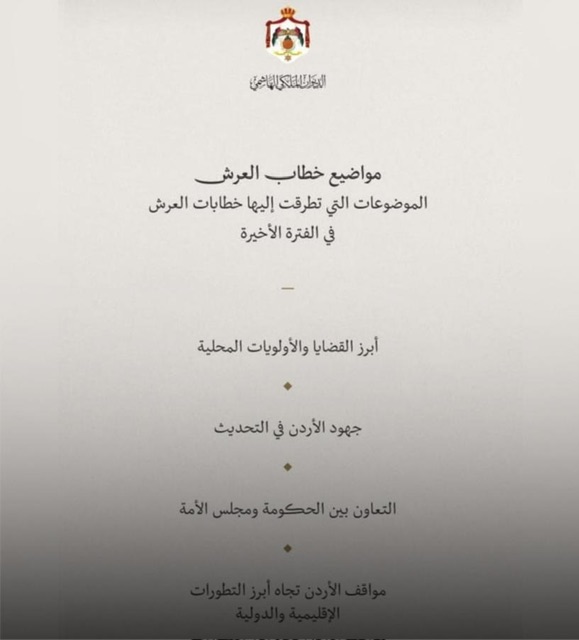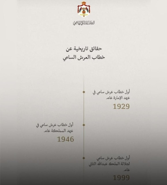 كما أوضح الديوان أن خطابات العرش تعد وثائق تاريخية تؤرخ لمراحل تطور الدولة، ومسيرة الحياة الديمقراطية، وأهم الأحداث السياسية التي شهدتها المملكة، وتعكس قيم الدولة الأردنية ومواقفها.