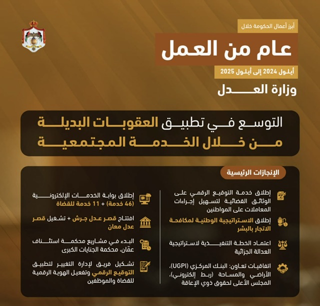 وشهد العام توسعا لافتا في تطبيق العقوبات البديلة من خلال الخدمة المجتمعية، إلى جانب تعزيز منظومة العدالة الرقمية وتحسين جودة الخدمة المقدمة للمواطنين.