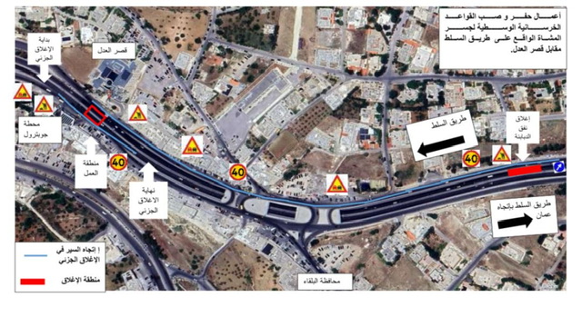 أعلنت وزارة الأشغال العامة والإسكان عن تنفيذ تحويلات مرورية مؤقتة وجزئية على طريق عمّان–السلط مقابل قصر العدل في محافظة البلقاء، وذلك ضمن أعمال الحفريات وصب القواعد الخرسانية في الجزيرة الوسطية.